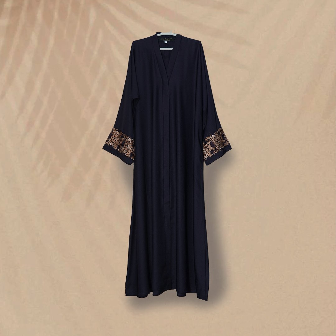 Step into timeless sophistication with this striking black abaya, designed for those who appreciate subtle luxury. Crafted from a rich, flowing fabric, its minimalist silhouette is elevated by wide sleeves adorned with intricate gold embroidery—a refined detail that adds regal charm without overpowering the look.