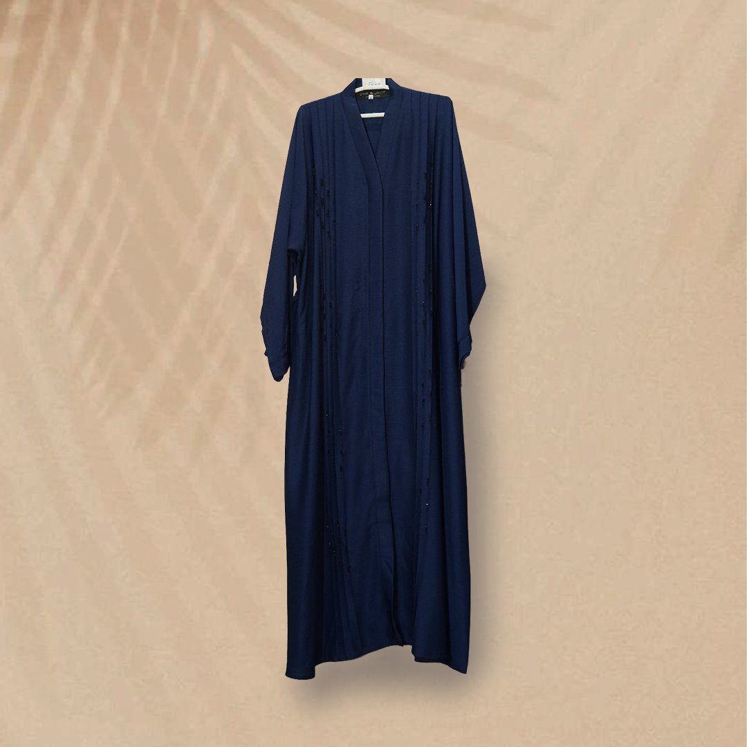 Crafted from the smooth, excellent-draping Zoom fabric, this abaya is presented in a deep, timeless navy blue color—a universally flattering alternative to black.